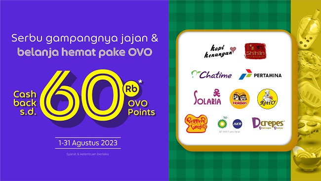 Selama bulan Agustus, kamu bisa jajan dan belanja ekstra hemat di banyak merchant favorit dan raih cashback hingga 60.000 OVO Points lho!