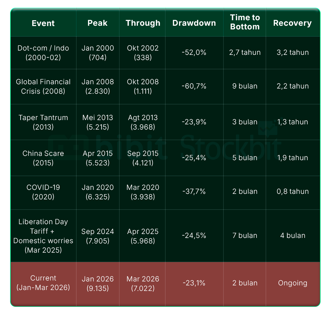 | | Per 31 Maret 2026, IHSG diperdagangkan pada valuasi 10,9x 1–Year Forward P/E, sekitar -2 Standard Deviation di bawah rata–rata historis 15 tahun. Level ini merupakan yang terendah sejak 'pandemi Covid-19 2020' dan 'selloff Liberation Day 2025.' | | | Berdasarkan data Bloomberg sejak 2000, penurunan dari peak ke bottom (drawdown) sebesar -23% pada kali ini berada di kisaran yang sama dengan saat 'Taper Tantrum 2013' (-24%), 'China Scare 2015' (-25%), dan 'selloff Liberation Day 2025' (-25%). Jika pola yang sama terjadi, hal ini mengindikasikan bahwa IHSG sudah berada/mendekati area bottom. | | | Secara historis, penurunan lanjutan yang signifikan lebih dari 24–25% hanya terjadi pada episode 'Dot–com Bust awal 2000' (-52%), 'Global Financial Crisis 2008' (-61%), dan 'pandemi COVID-19 2020' (-38%), di mana ketiganya merupakan krisis yang berskala jauh lebih besar. | | |