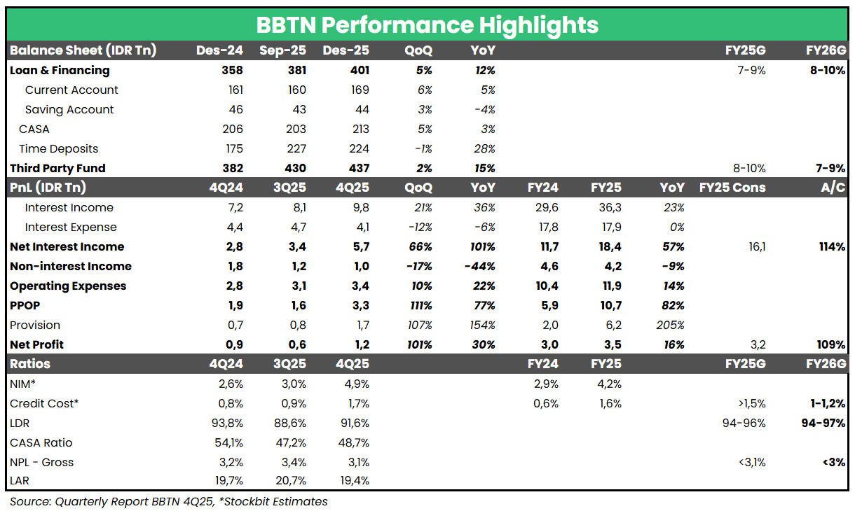 - $BJTM: Direktur Utama Bank Pembangunan Daerah Jawa Timur, Winardi Legowo, mengatakan bahwa pihaknya menargetkan pertumbuhan laba bersih 2026 lebih tinggi dibandingkan realisasi 2025 (vs. 9M25: +14% YoY), meski tidak merincinya lebih lanjut karena masih dalam proses perumusan rencana bisnis di OJK. Selain itu, BJTM juga menargetkan rasio beban operasional terhadap pendapatan operasional (BOPO) berada di bawah 80% pada 2026 (vs. realisasi bank–only 9M25: 81%). BJTM juga mengincar penambahan minimum ~1 juta pengguna terdaftar J–Connect selama 2026, sehingga total pengguna mencapai 2 juta.