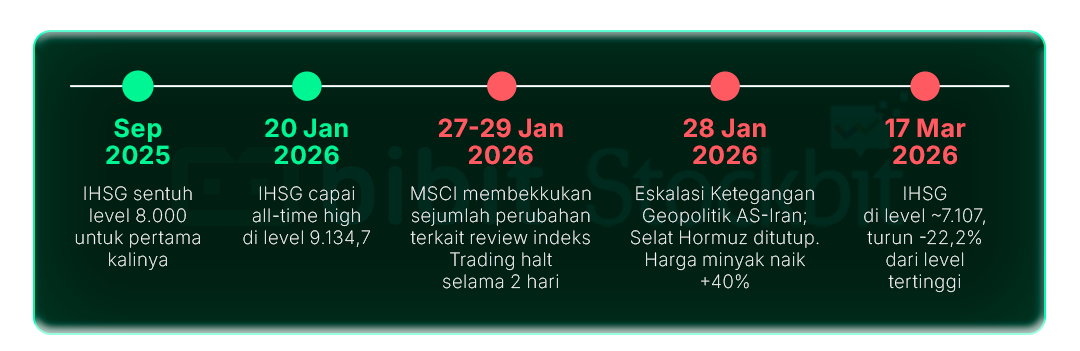 IHSG telah turun -23,1% dari level all–time high di ~9.135 pada 20 Januari 2026 ke level ~7.022 pada hari terakhir perdagangan bursa sebelum periode libur Lebaran (16 Maret 2026). |