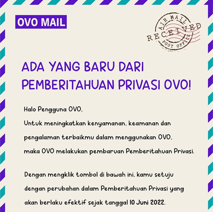 Halo Pengguna OVO, untuk meningkatkan kenyamanan, keamanan dan pengalaman terbaikmu dalam menggunakan OVO, maka OVO melakukan pembaruan Pemberitahuan Privasi. Yuk cermati di sini!