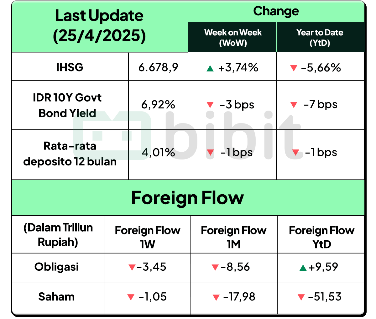 Sumber: Bloomberg per 25 April 2025, kecuali Foreign Flow Obligasi per 22 April 2025 |